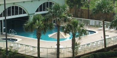 Beach side pool at Celadon offers a beautiful view while taking a swim or relaxing in the hot tub.